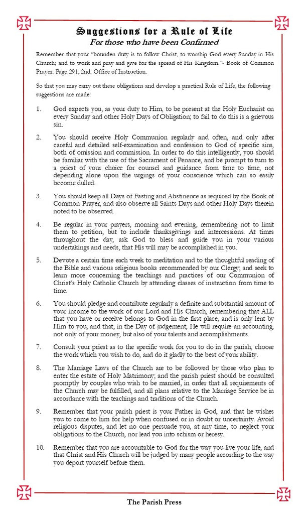 This attractive Confirmation certificate matches the Traditional Baptism Certificate. Printed on card stock, one side allows ample room for the certificate to be inscribed with appropriate space for the Bishop’s signature. The reverse side contains guidelines for a Rule of Life for the Confirmand which echoes what is contained in traditional versions of the Book of Common Prayer. It is suitable for framing or being placed in a presentation book at Confirmation