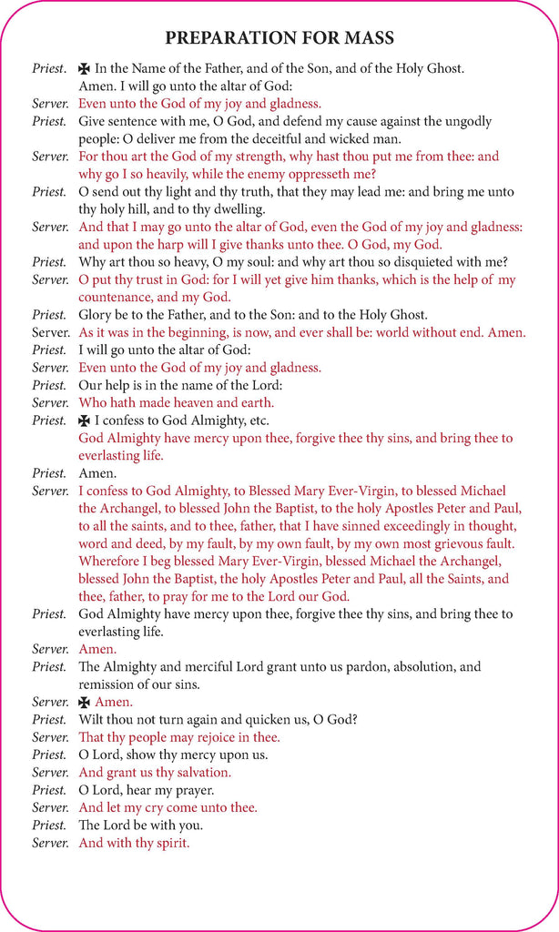 “Preparation for Mass” and “The Use of Sanctus Bells at Mass”. White Heavy Card Stock 6 inches by 10 inches This Card has on one side the “Preparation For Mass” card, commonly called “Prayers at the Foot of the Altar,” and on the other side, “The Use of Sanctus Bells at Mass.” This card is printed on card stock, with rounded corners, and can conveniently be placed next to the Sanctus Bells as a convenience for the Server. This prevents the need for two cards, and is especially convenient for churches that do the Preparation Prayers at the Foot of the Altar and also use Sanctus Bells.
